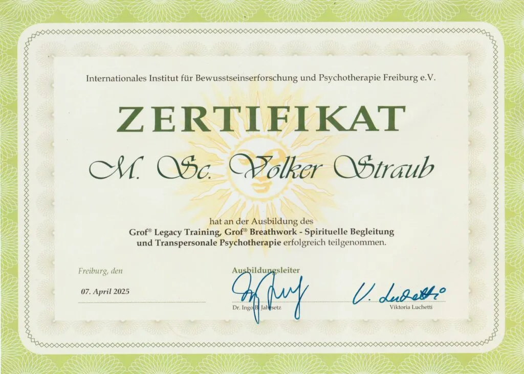 Seit Herbst 2022 war ich in einer dreijährigen Ausbildung holotropes Atmen (Grof Legacy Training ®) bei ➜ Dr. Ingo Jahrsetz mit einer konstanten 30-köpfigen Gruppe. Dabei erforschte ich mich Selbst, meine eigenen Trigger und Themen, wodurch ich „das Eigene“ von den Themen meiner KlientenInnen besser unterscheiden lernte.